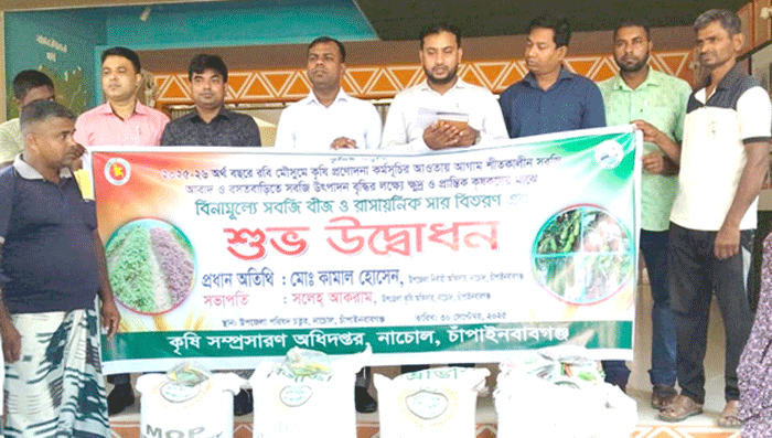 ধূমকেতু প্রতিবেদক,নাচোল : কৃষি প্রণাদনা কর্মসূচীর আওতায় আগাম শীতকালীন শাকসবজির উৎপাদন বৃদ্ধির লক্ষ্যে নাচোল উপজেলা কৃষি অফিসের উদ্যোগে কৃষকদের মাঝে শাকসবজির বীজ ও সার বিতরণ করা হয়েছে। আজ মঙ্গলবার সকাল ১১ টায় উপজেলা পরিষদ চত্বরে উপজেলা কৃষি অফিসার সলেহ্ আকরাম এ উদ্বোধন করেন।