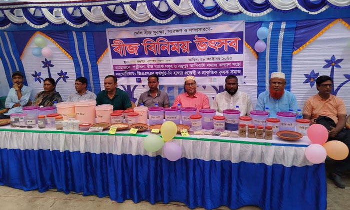 এহেন পরিস্থিতিতে আন্তর্জাতিক স্বেচ্ছাব্রতি সংস্থা দি হাঙ্গার প্রজেক্ট ও সম্ভুপুর আদিবাসি সমাজ কল্যাণ সংস্থার আয়োজনে ২৮ অক্টোবর ২০২৫ দেশি বীজ সুরক্ষা, সংরক্ষণ ও সম্প্রসারণে – “বীজ বিনিময় উৎসব” অনুষ্ঠিত হলো। পত্নীতলা উপজেলার বীজ ব্যাংকসমূহ এবং সম্ভুপুর আদিবাসি সমাজ কল্যাণ সংস্থার আয়োজনে অনুষ্ঠিত হলো এ বীজ বিনিময় উৎসব। বীজ বিনিময় উৎসব উপলক্ষে আলোচনা সভায় সম্ভুপুর আদিবাসি সমাজ উন্নয়ন সংস্থার সভাপতি ও সম্ভুপুর গ্রাম উন্নয়ন দলের সাধারণ সম্পাদক পরিতোষ পাহানের সভাপতিত্বে অতিথি হিসেবে উপস্থিত ছিলেন পত্নীতলা প্রেসক্লাবের সভাপতি আলহাজ্ব বুলবুল চৌধুরী, বাংলাদেশ জাতিয়তাবাদি দলের সিনিয়র সহ-সভাপতি সাজেদুর রহমান দুলাল, বাংলাদেশ জাতীয়তাবাদী মহিলা দল পত্নীতলা উপজেলা শাখার সভাপতি মরিয়ম বেগম শেফা, জাতীয় আদিবাসী পরিষদের কেন্দ্রীয় সাধারণ সম্পাদক নরেন পাহান, দি হাঙ্গা প্রজেক্ট এর রাজশাহী অঞ্চলের সমন্বয়কারী মিজানুর রহমান, সাবেক কৃষি কর্মকর্তা জয়নাল আবেদীন, উপসহকারী কৃষি কর্মকর্তা ইসাহাক আলী, দি হাঙ্গার প্রজেক্ট এর সিনিয়র প্রোগ্রাম অফিসার সোহেল রানা, আদিবাসী নেত্রী আদরি পাহান, জাতীয় আদিবাসী পরিষদ পত্তনীতলা উপজেলা শাখার সাধারণ সম্পাদক পরেশ টুড, প্রাণবৈচিত্র খামার ও প্রাকৃতিক কৃষক সমাজের সভাপতি ইফতেখার আলী, লুব্ধ ধানের সংগ্রাহক ও উৎপাদক প্রকৌশলী হাসান জামান সিদ্দিকপ্রমূখ।