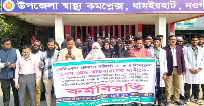 ধূমকেতু প্রতিবেদক, ধামইরহাট : নওগাঁর ধামইরহাটে মেডিকেল টেকনোলজিস্ট ও ফার্মাসিস্টদের ১০ম গ্রেড বাস্তবায়ন পরিষদের উদ্যোগে কর্মবিরতি কর্মসূচি পালন করা হয়েছে। ৩০ নভেম্বর সকাল ৯ টা থেকে ১১ টা পযন্ত ১০ম গ্রেড বাস্তবায়নের দাবীতে ধামইরহাট স্বাস্থ্য কমপ্লেক্সের মেডিকেল টেকনোলজিস্ট ও ফার্মাসিস্টগণদের এই আন্দোলনে একাত্বতা প্রকাশ করেন আইএইচটির শিক্ষার্থীরা।