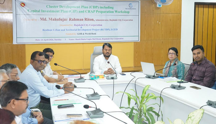 ধূমকেতু প্রতিবেদক : রাজশাহী সিটি কর্পোরেশন এবং রেজিলিয়েন্ট আরবান এন্ড টেরিটোরিয়াল ডেভেলপমেন্ট প্রজেক্ট, এলজিইডি এর আয়োজনে ক্লাস্টার উন্নয়ন ও ক্যাপিটাল বিনিয়োগ উন্নয়ন পরিকল্পনা বিষয়ক কর্মশালা অনুষ্ঠিত হয়েছে। মঙ্গলবার (২১ এপ্রিল) নগর ভবনের সরিৎ দত্তগুপ্ত নগর সভাকক্ষে আয়োজিত কর্মশালায় সভাপতিত্ব করেন রাজশাহী সিটি কর্পোরেশনের মাননীয় প্রশাসক মোঃ মাহফুজুর রহমান রিটন।