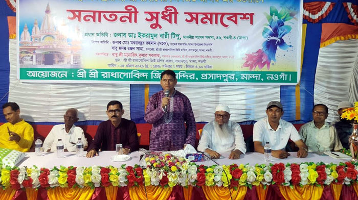 ধূমকেতু প্রতিবেদক,মান্দা : নওগাঁর মান্দা উপজেলার প্রসাদপুর রাধা-গোবিন্দ জিউ মন্দির প্রাঙনে সনাতন ধর্মাবম্বীদের নিয়ে সুধী সমাবেশ অনুষ্ঠিত হয়েছে। আজ শনিবার (২৫ এপ্রিল) বিকেলে আয়োজিত অনুষ্ঠানে স্থানীয় সংসদ সদস্য ডা. ইকরামুল বারী টিপু প্রধান অতিথি ছিলেন।