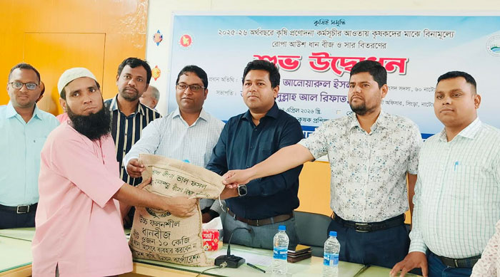 ধূমকেতু প্রতিবেদক, সিংড়া : নাটোরের সিংড়ায় কৃষি প্রণোদনা কর্মসূচির আওতায় ২০২৫-২৬ অর্থ বছরের খরিপ-১ মৌসুমে ৪ হাজার কৃষকের মাঝে বিনামূল্যে রোপা আউশ বীজ ও সার বিতরণ করা হয়েছে।