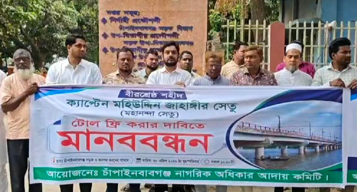 এ সময় বক্তারা বলেন, ১৯৯৩ সালে চাঁপাইনবাবগঞ্জের মহানন্দা নদীর ওপর নির্মিত বীরশ্রেষ্ঠ শহীদ ক্যাপ্টেন মহিউদ্দিন জাহাঙ্গীর সেতুতে দীর্ঘ ৩৩ বছর ধরে টোল আদায় করা হচ্ছে। কিন্তু বহু আগেই এই সেতুর নির্মাণ ব্যায় সরকারী কোষাগারে জমা হয়ে গেলেও এখনো টোল আদায় বজায় রেখেছে সেতু কর্তৃপক্ষ। যা জেলার সাধারন খেটে খাওয়া মানুষের ওপর মরার ওপর খারার ঘা হয়ে আছে। আর তাই এই সেতুতে সকল প্রকার যানবাহনের টোল আদায় বন্ধের দাবী জানান বক্তারা। অন্যথায় কঠোর আন্দোলনের হুশিয়ারী দেয়া হয় মানববন্ধন থেকে।